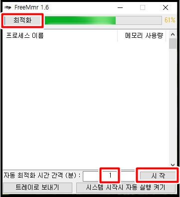 다운로드가 끝나셨다면 실행을 하시면 아래와 같은 창이 뜨는데 좌측 상단에 '최적화'는 수동으로 최적화를 하는 기능입니다. '자동 최적화 시간 간격'을 1시간으로 설정하시고 시작을 누르시면 1시간마다 자동으로 메모리 최적화가 진행됩니다. 시간 설정은 분으로 설정해야 합니다. 1시간->60분, 10시간->600분