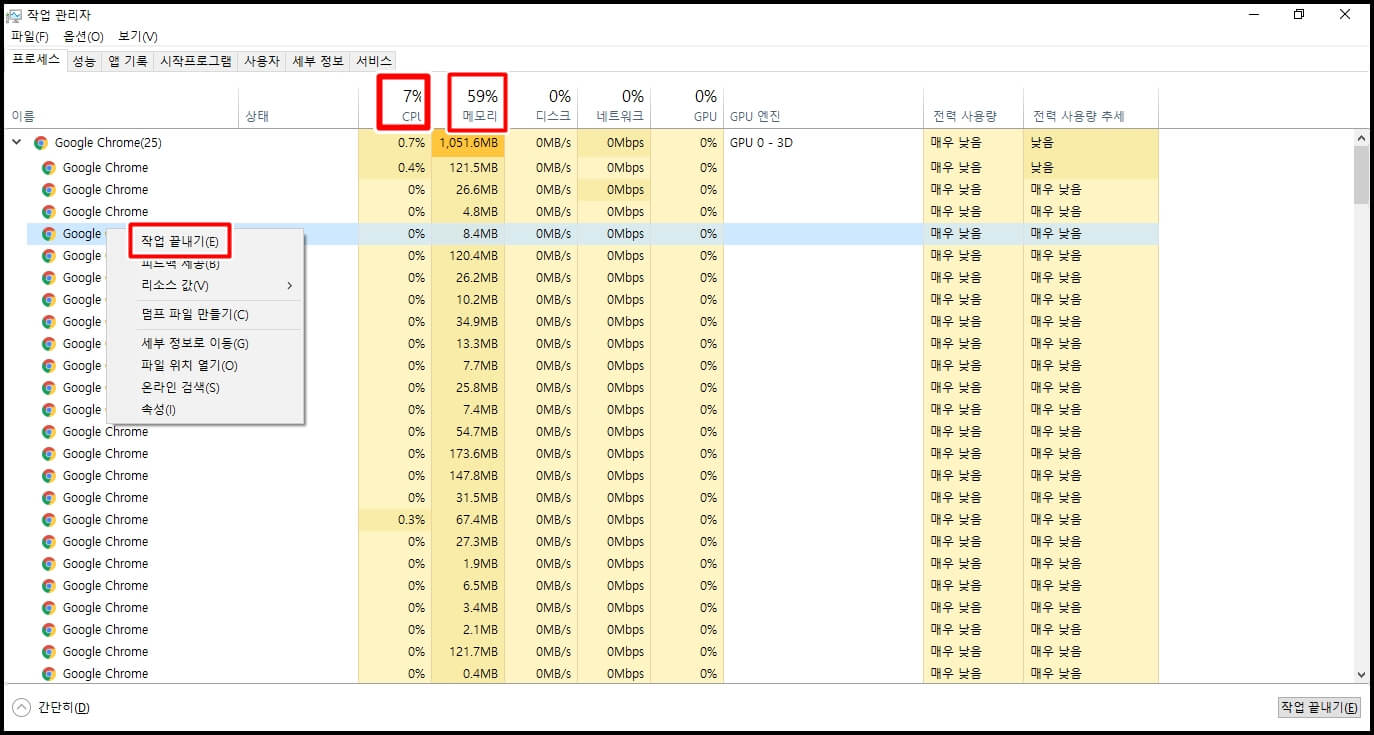 Ctrl+Shift+ESC를 동시에 누르게 되면 작업 관리자가 실행이 되는데 여기서 CPU와 메모리의 점유율을 확인해 봐야 합니다. 보통은 CPU, 메모리 모두 80% 이상이면 위험한 걸로 판단하시면 되고 40~70%가 안정적이라고 볼 수 있겠습니다. 점유율이 높다면 필요 없는 프로그램들은 작업을 끝내주시면 되겠습니다. 간혹 CPU 점유율이 80~90% 이상이 된다면 윈도 업데이트일 경우가 있으니 확인해주시면 됩니다.
